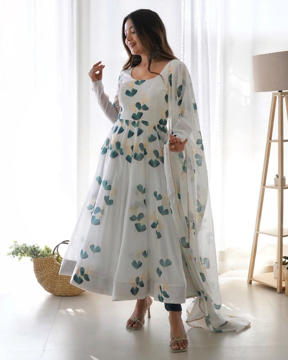 Elevate your style with our White Digital Printed Tabby Silk Organza Dress with Dupatta. This exquisite ensemble seamlessly blends traditional charm with contemporary flair. The tabby silk organza fabric lends an ethereal touch, while the intricate digital print adds a modern edge. The dress features a flattering silhouette that accentuates your elegance, making it perfect for special occasions. Complete the look with the accompanying dupatta, enhancing the outfit's grace and sophistication. Embrace timeless beauty and make a statement in this enchanting ensemble.